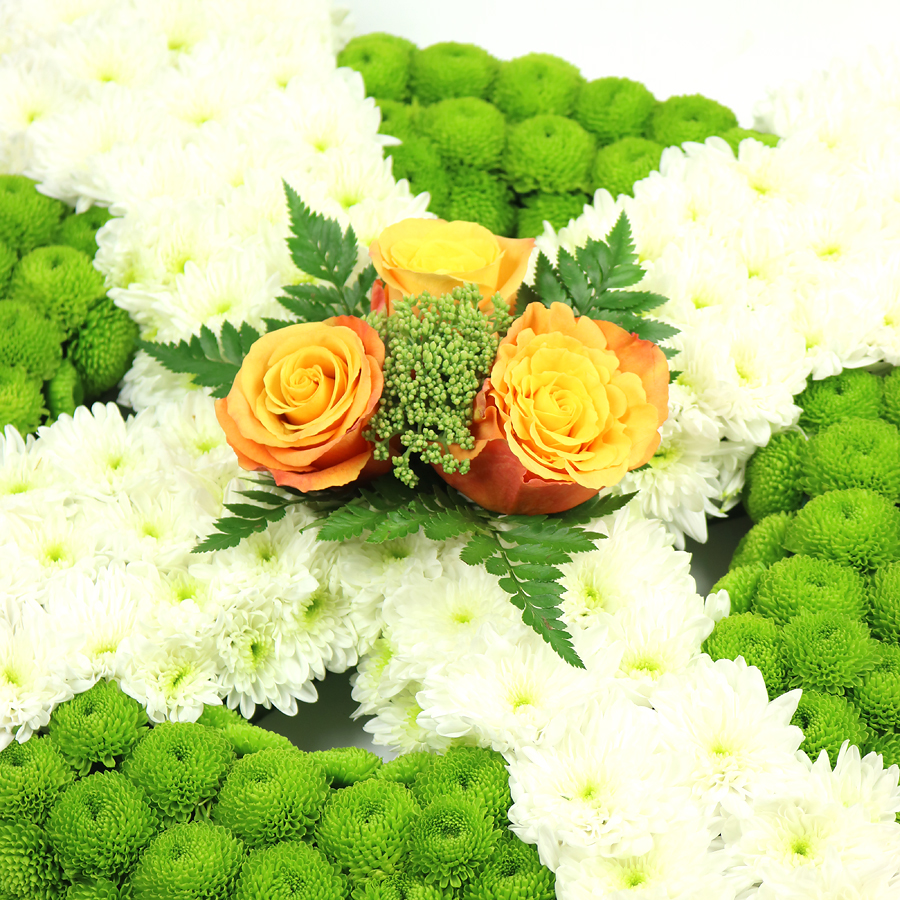 Experience the splendor of our unique bouquet, featuring white and green spray chrysanthemums alongside vibrant orange roses and fresh greenery. This stunning arrangement beautifully expresses love and care with its harmonious color palette and sophisticated design.